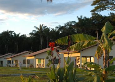 | Clients stay in well-furnished air-conditioned bungalows. Each bungalow has a large front and back porch, hammock and sitting area. Inside there is a main room with two double beds, a reading area, frigobar, TV, and table. The bathroom is large and well designed. A ten inch shower head will let you know that you are in the land of water. The bungalows have hot and cold running water, flushing toilets and enough storage for even the best packed fishermen. The hot water is provided by solar panels. Ready to join us at the Agua Boa Amazon Lodge? Give us a call 888.347.4286 or email info@amazonbass.com |